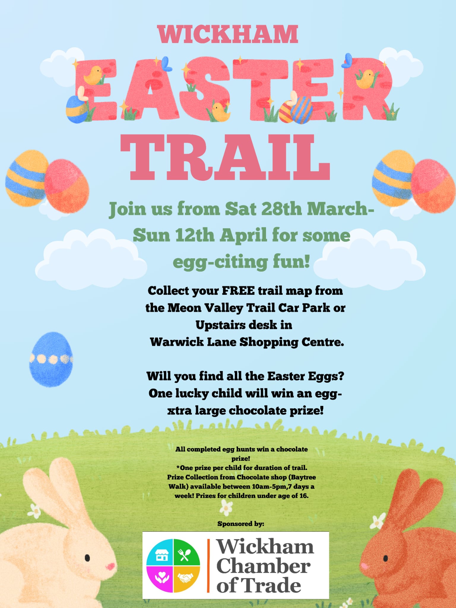 Wickham Hampshire, United KingdomJoin us for some egg-citing fun from Saturday 28th March until Sunday 12th April Collect your FREE trail map from the upstairs desk in Warwick Lane Shopping Centre (or from Statioon Road Car Park) HOW MANY EGGS WILL YOU FIND HIDDEN AROUND THE SQUARE? There are questions to answer on the way round too! All [...]